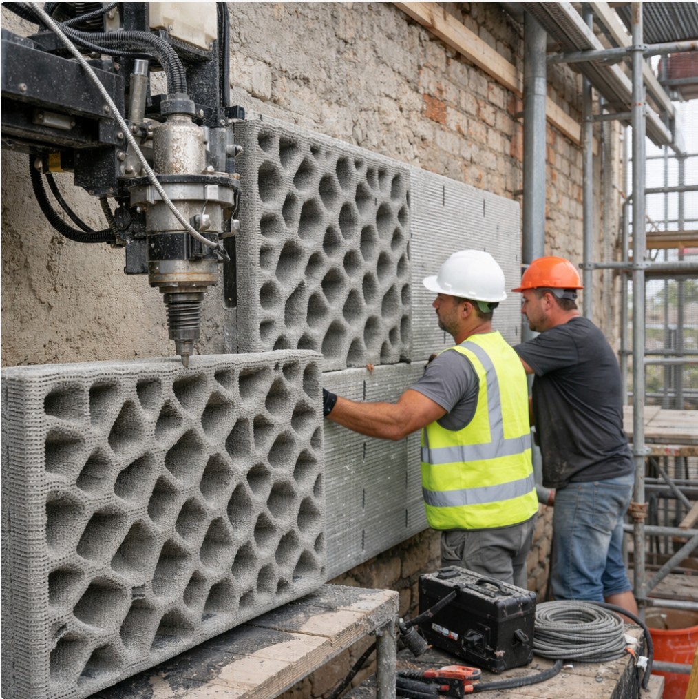 Ein Forschungsprojekt der Technischen Universität Hamburg (TUHH) und des Ingenieurdienstleisters TECCON Consulting & Engineering arbeitet an einer neuen Lösung für die energetische Gebäudesanierung: Dämmplatten für Fassaden sollen künftig direkt auf der Baustelle per 3D-Druck hergestellt werden. Ziel ist ein Verfahren, das die Montage vereinfacht, Material präziser einsetzt und den Personalbedarf auf der Baustelle senken kann.